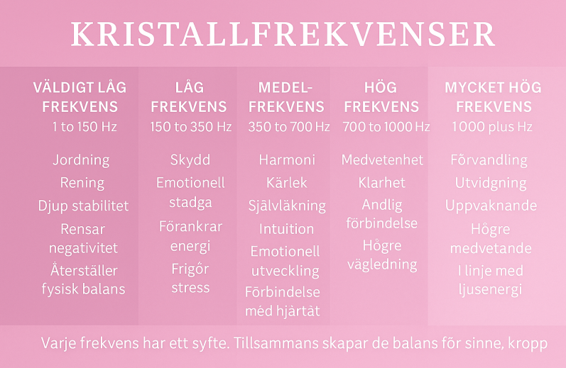 Inom kristallhealing talar man ofta om ”kristallfrekvenser”, det vill säga den unika vibrationsnivå som varje kristall sägs avge. Denna vibration påverkar både vår energi och vårt inre tillstånd, och kan bidra till balans mellan kropp, sinne och själ.