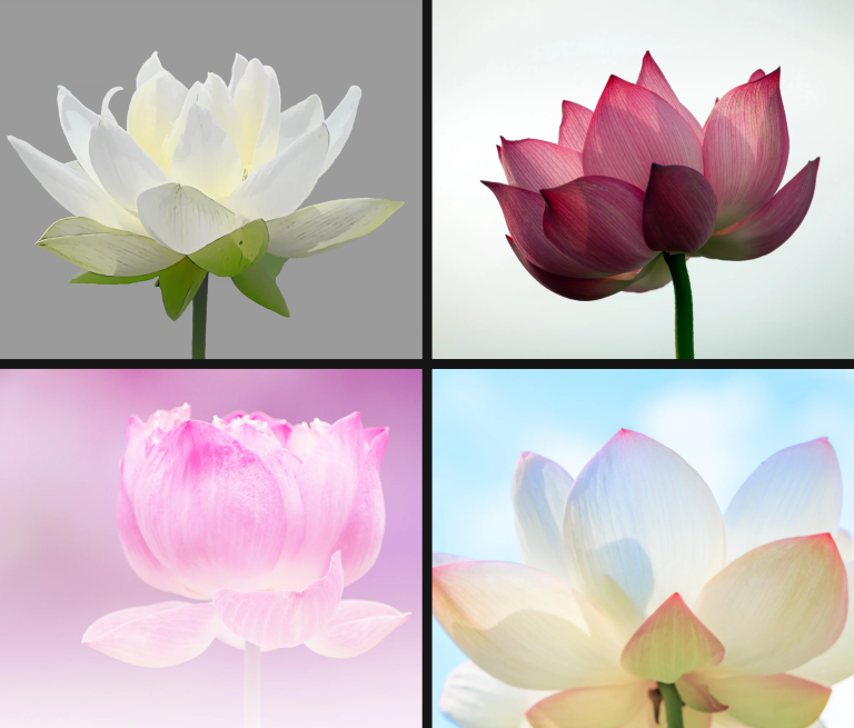 - Stängd eller öppen blomma: Stängd – potential och praktik; halvöppen – pågående transformation; full blom – realiserad visdom.
